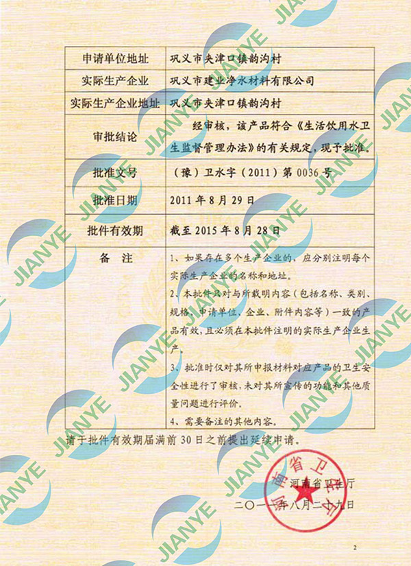 16-20建業(yè)牌錳砂濾料衛(wèi)生批件